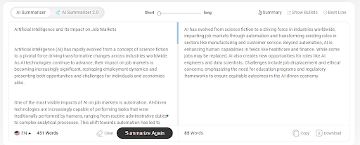 Ahora es el momento de elaborar un resumen utilizando el resumidor de texto seleccionado. Para ello, debe introducir el artículo en el cuadro de entrada, establecer la longitud del resumen (según sus necesidades) y pulsar el botón «Resumir». La herramienta generará un resumen de IA coherente de su artículo.