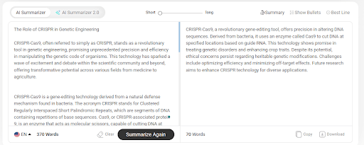 Resumamos un artículo relacionado con la ciencia, es decir, «El papel de CRISPR en la ingeniería genética», con la ayuda del resumidor.